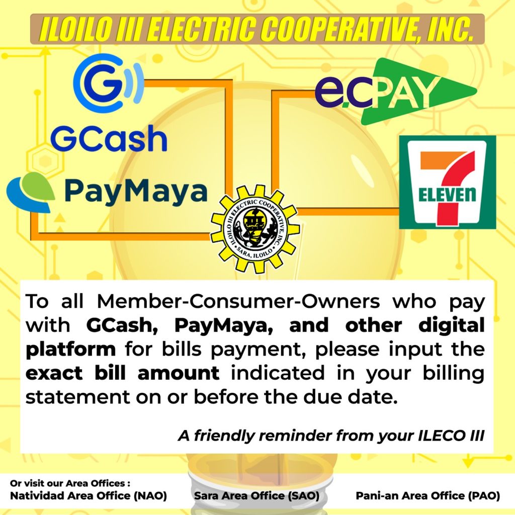 To all Member-Consumer-Owners who pay with GCash, PayMaya and other digital platform for bills payment, please input the exact bill amount indicated in your billing statement on or before the due date.