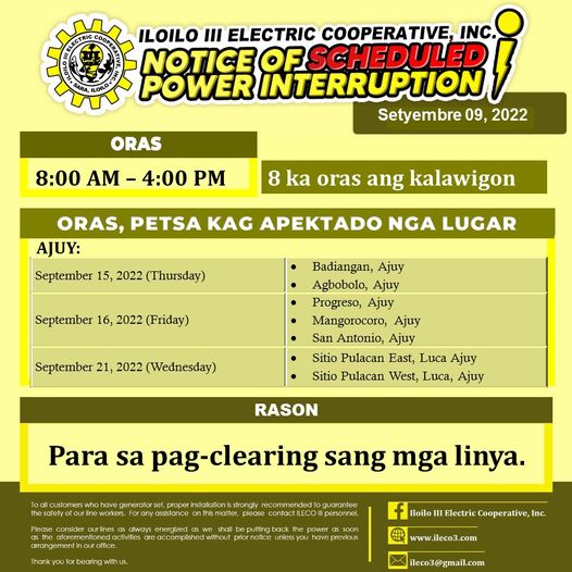 Pahibalo sa mga katapo-konsumidores nga may SCHEDULED POWER INTERRUPTION ang ILECO III para sa patigayunon nga pag-clearing sang mga linya.