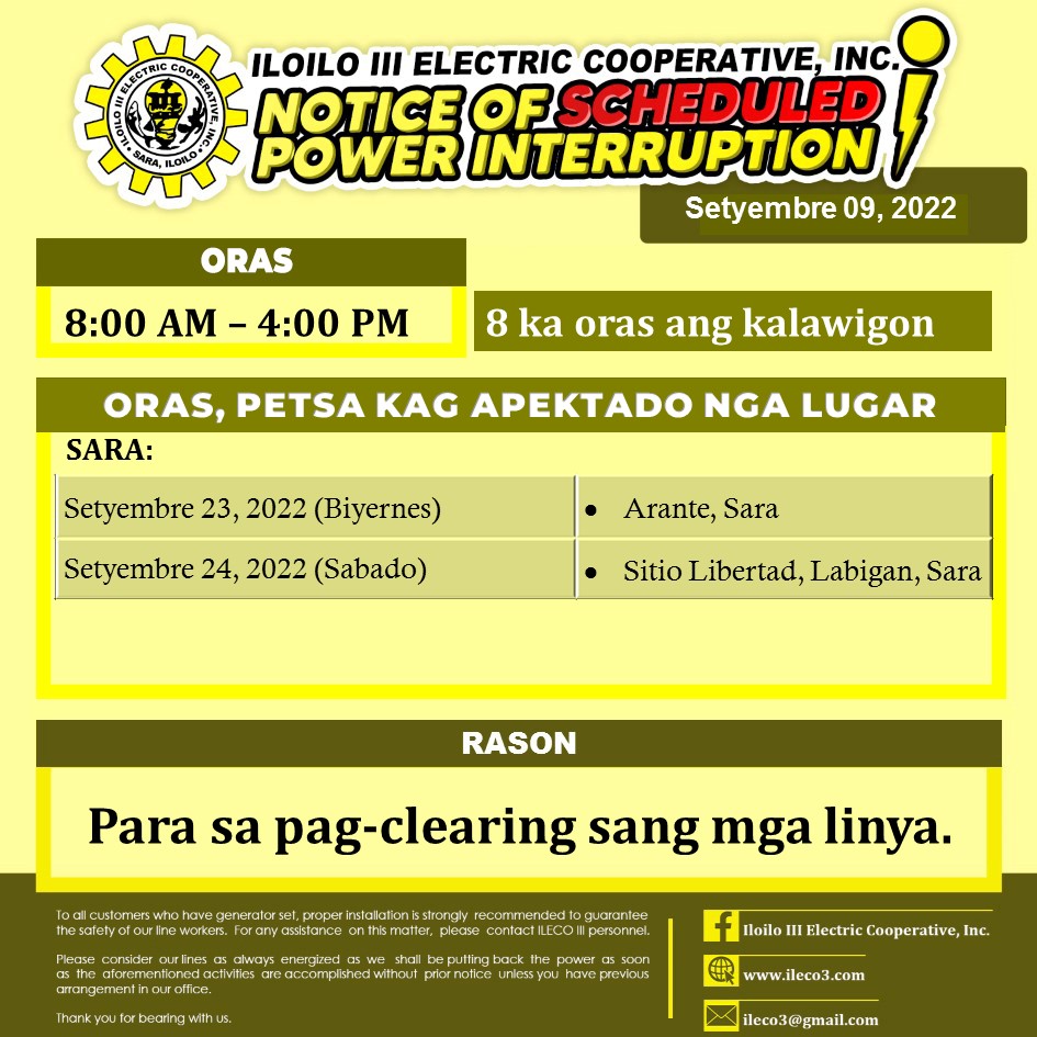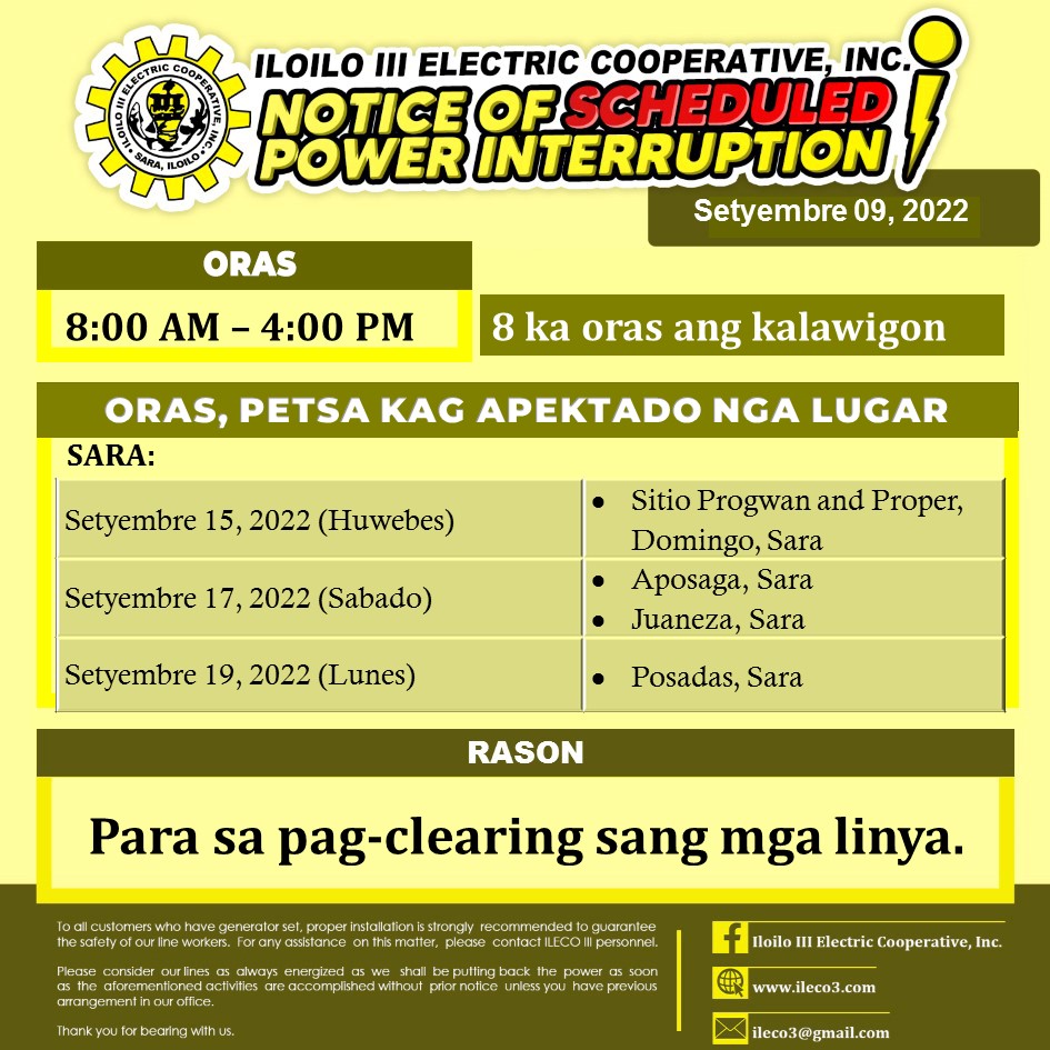 Pahibalo sa mga katapo-konsumidores nga may SCHEDULED POWER INTERRUPTION ang ILECO III para sa patigayunon nga pag-clearing sang mga linya.