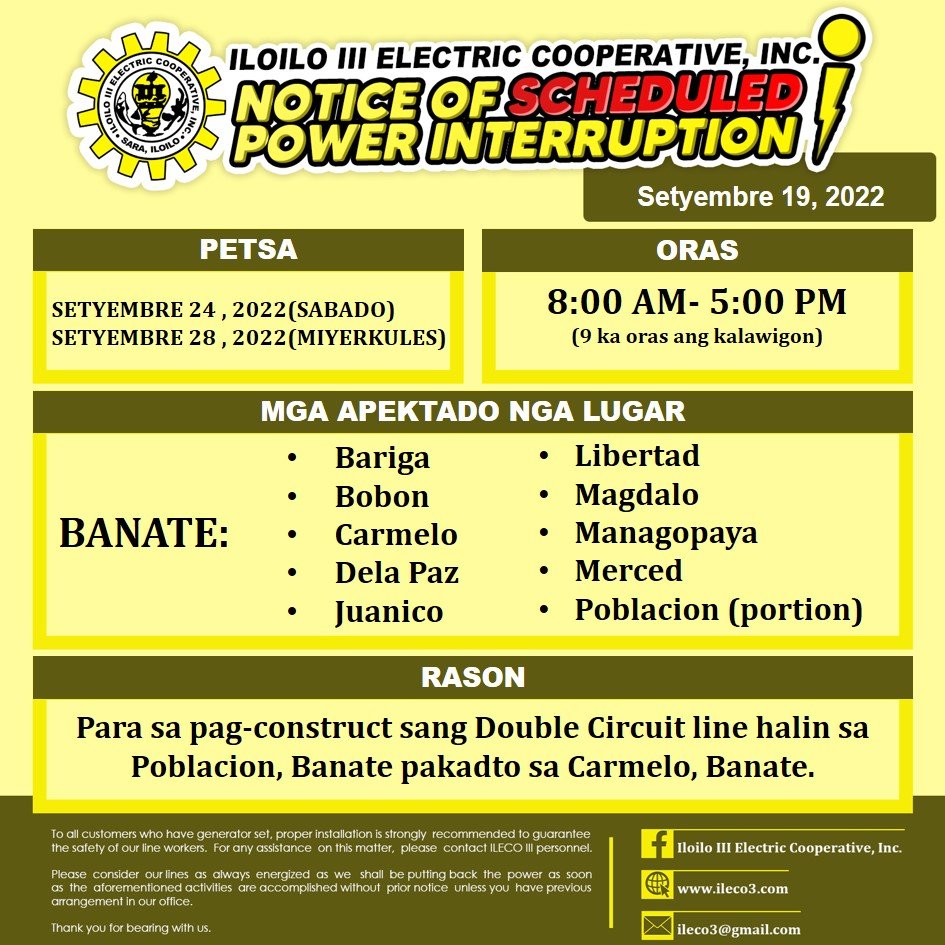 Pahibalo sa mga katapo-konsumidores nga may SCHEDULED POWER INTERRUPTION ang ILECO III para sa pag-construct sang Double Circuit line halin sa Poblacion, Banate pakadto sa Carmelo, Banate.
