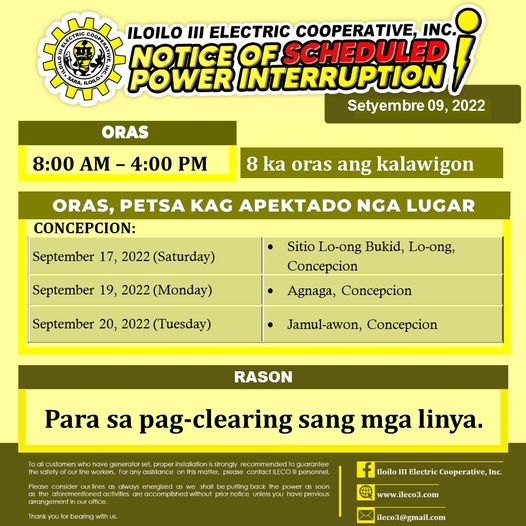 Pahibalo sa mga katapo-konsumidores nga may SCHEDULED POWER INTERRUPTION ang ILECO III para sa patigayunon nga pag-clearing sang mga linya.