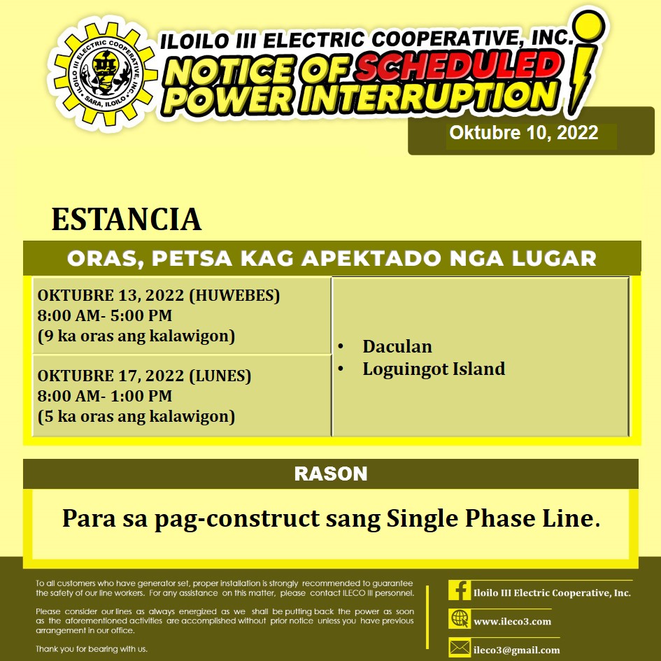 Pahibalo sa mga katapo-konsumidores nga may SCHEDULED POWER INTERRUPTION ang ILECO III para sa pag-construct sang Single Phase Line.