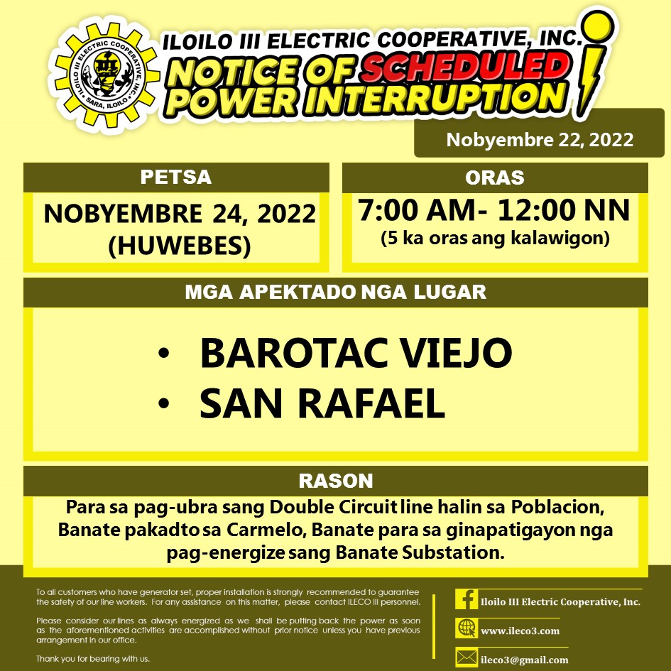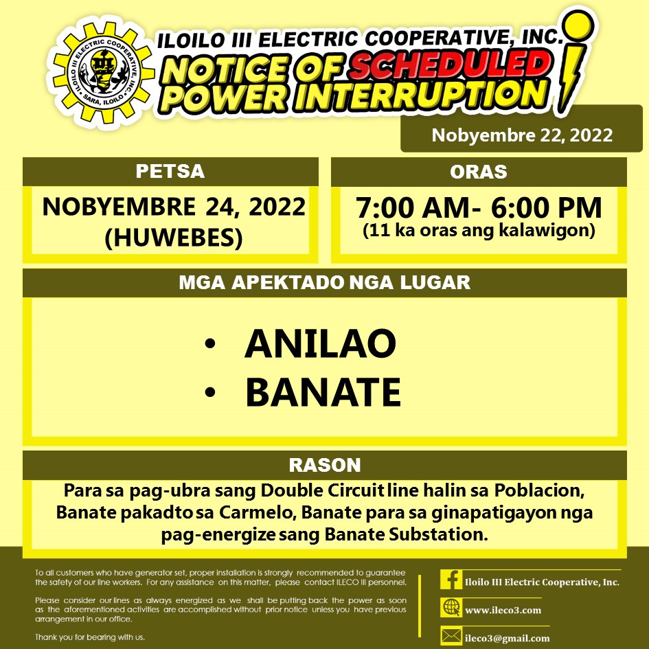 Pahibalo sa mga katapo-konsumidores nga may EMERGENCY POWER INTERRUPTION ang ILECO III para sa pag-construct sang Double Circuit Line halin sa Poblacion, Banate pakadto sa Carmelo, Banate para sa pag-energize sang Banate Substation.