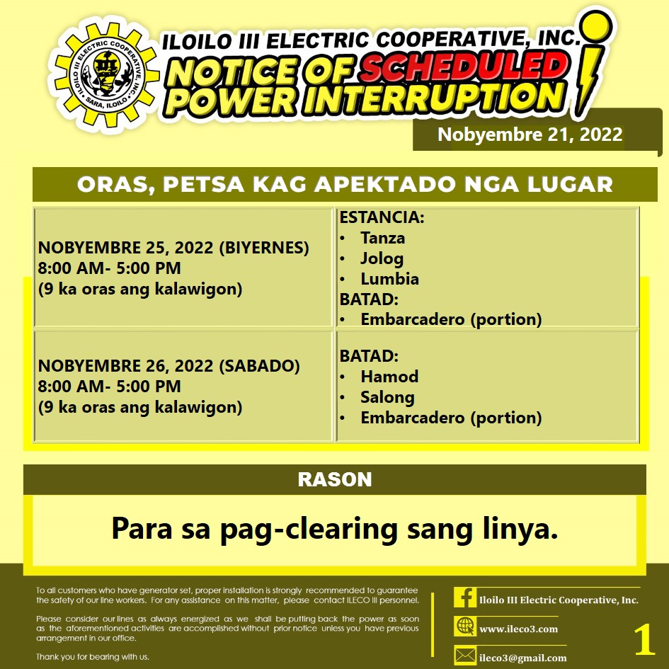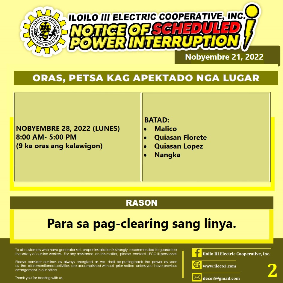 Pahibalo sa mga katapo-konsumidores nga may SCHEDULED POWER INTERRUPTION ang ILECO III para sa pag-clearing sang linya.