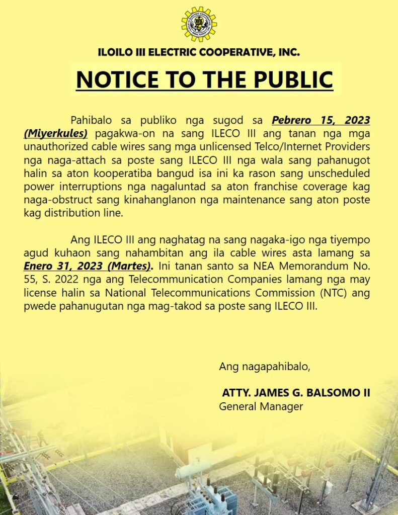 Pahibalo sa publiko nga sugod sa Pebrero 15, 2023 (Miyerkules) pagakwa-on na sang ILECO III ang tanan nga mga unauthorized cable wires sang mga unlicensed Telco/Internet Providers nga naga-attach sa poste sang ILECO III nga wala sang pahanugot halin sa aton kooperatiba bangud isa ini ka rason sang unscheduled power interruptions nga nagaluntad sa aton franchise coverage kag naga-obstruct sang kinahanglanon nga maintenance sang aton poste kag distribution line.