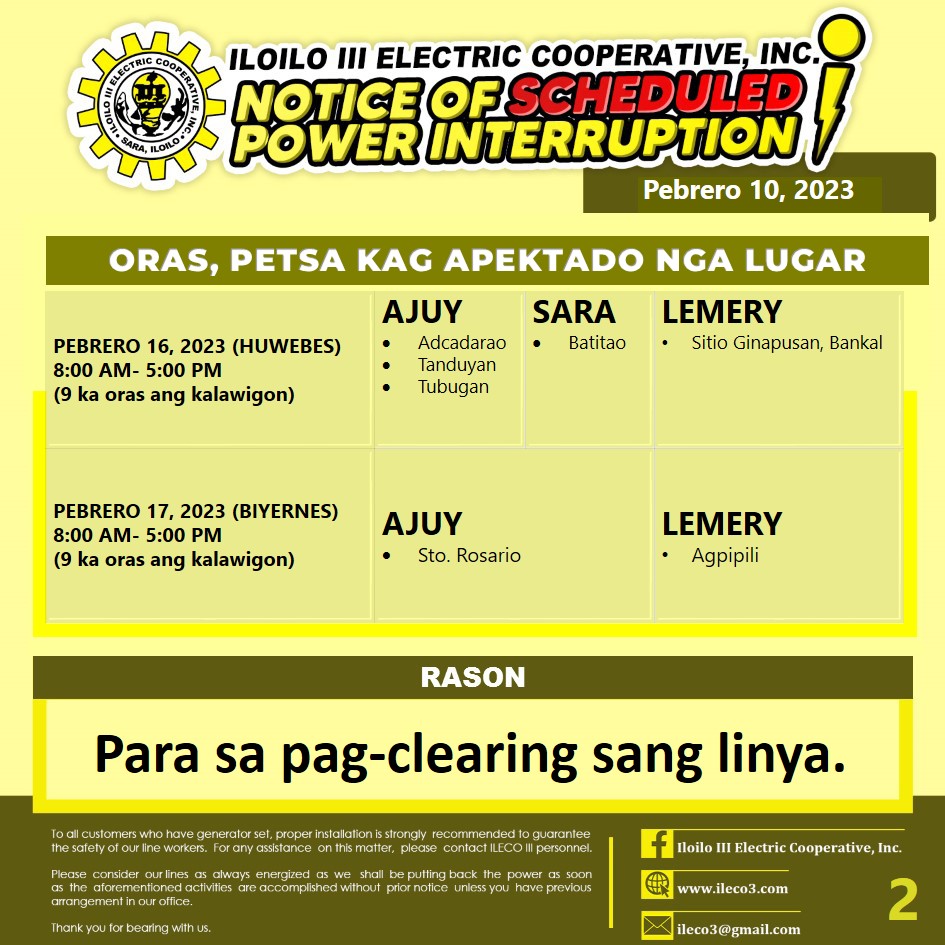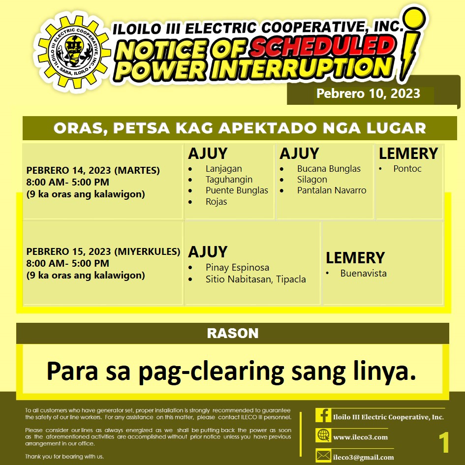 Ang petsa, oras kag lugar nga apektado sang sini nga power interruptions sa banwa sang AJUY, SARA kag LEMERY amo ang masunod: