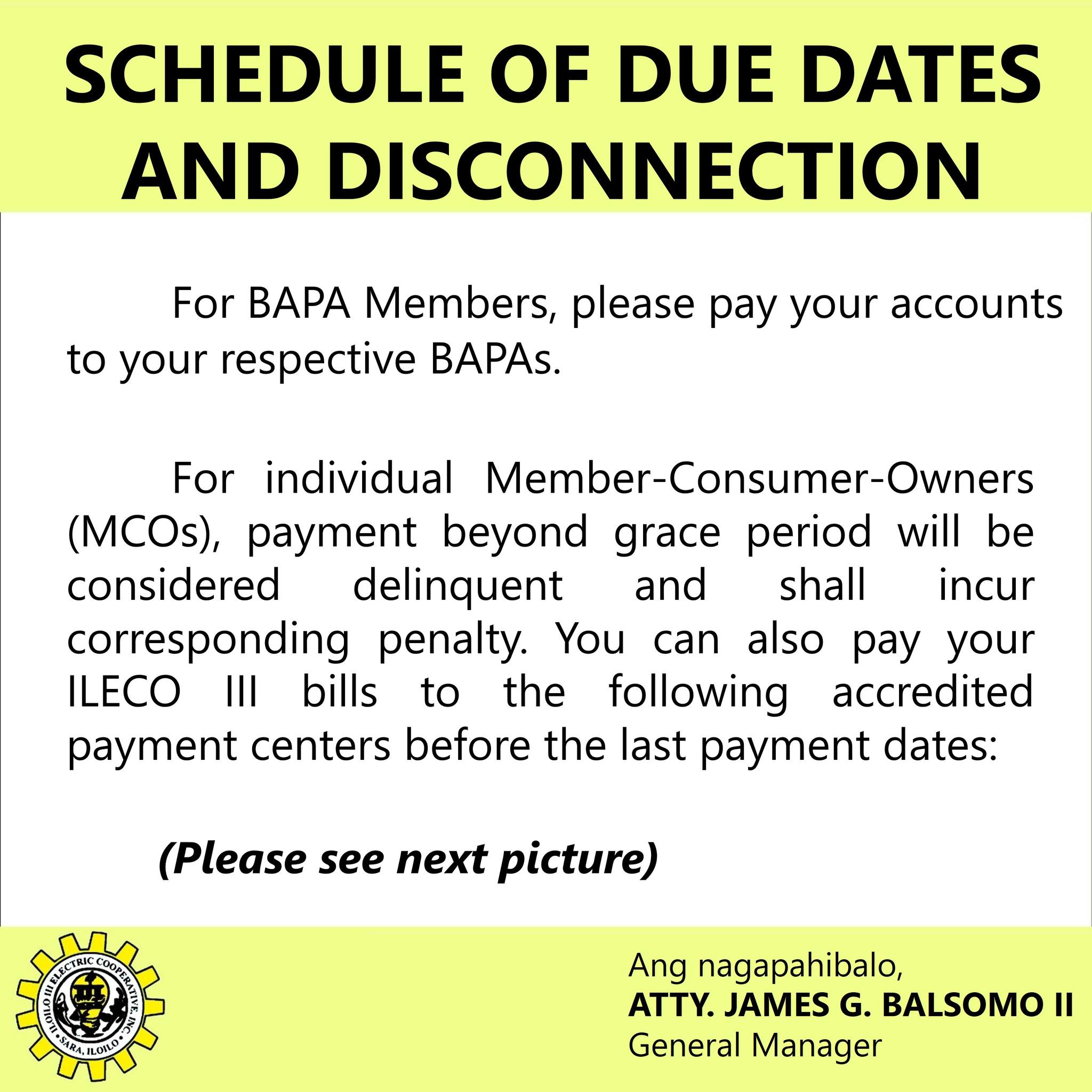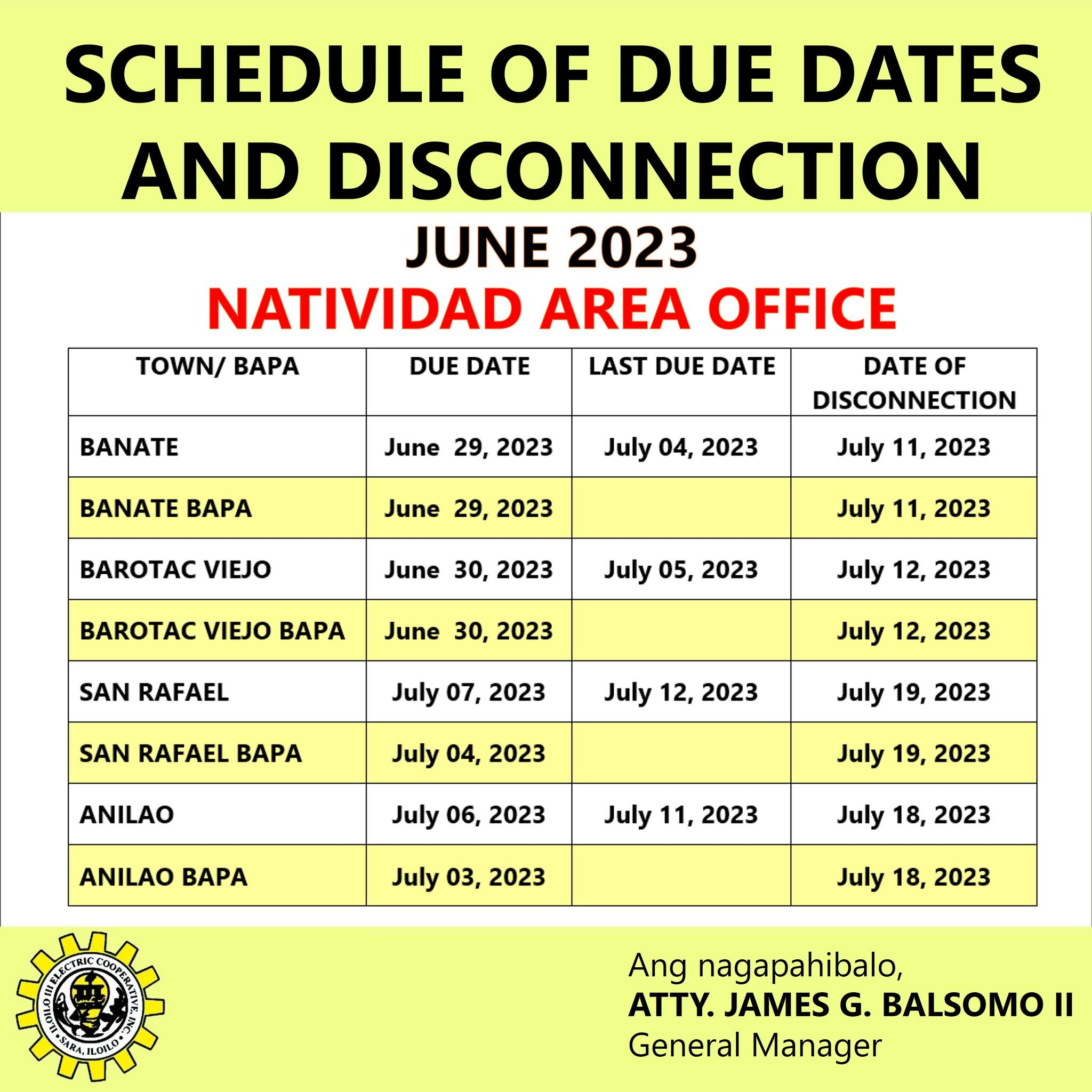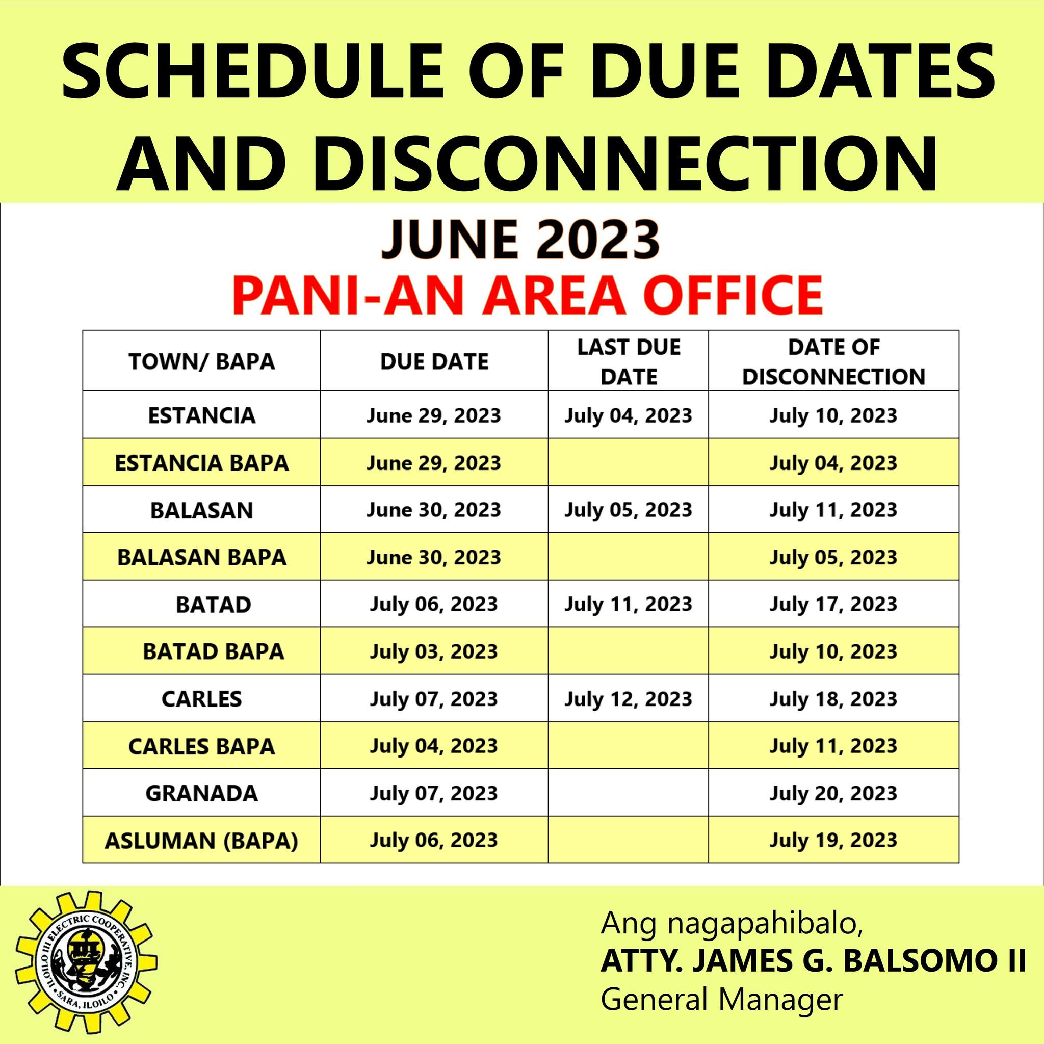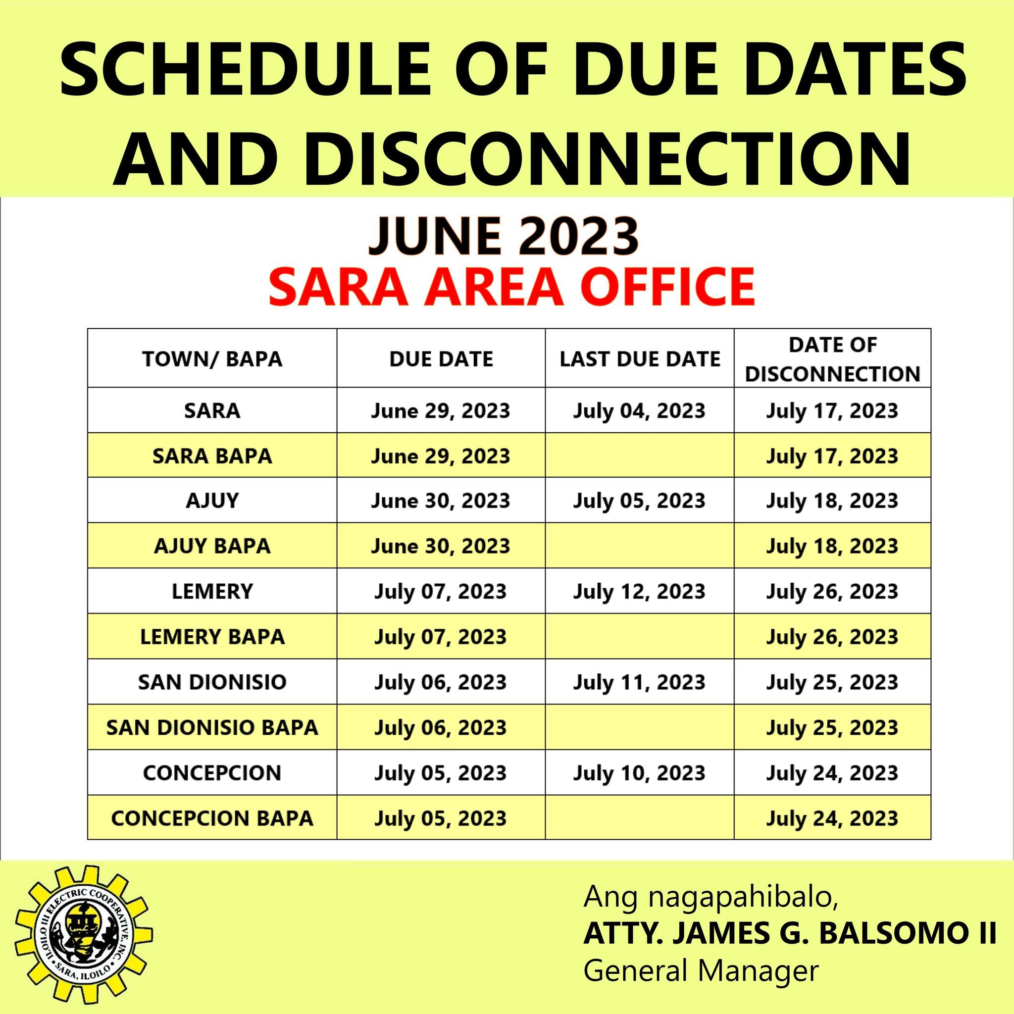 SCHEDULE OF DUE DATES AND DISCONNECTION FOR BILLING MONTH OF JUNE 2023