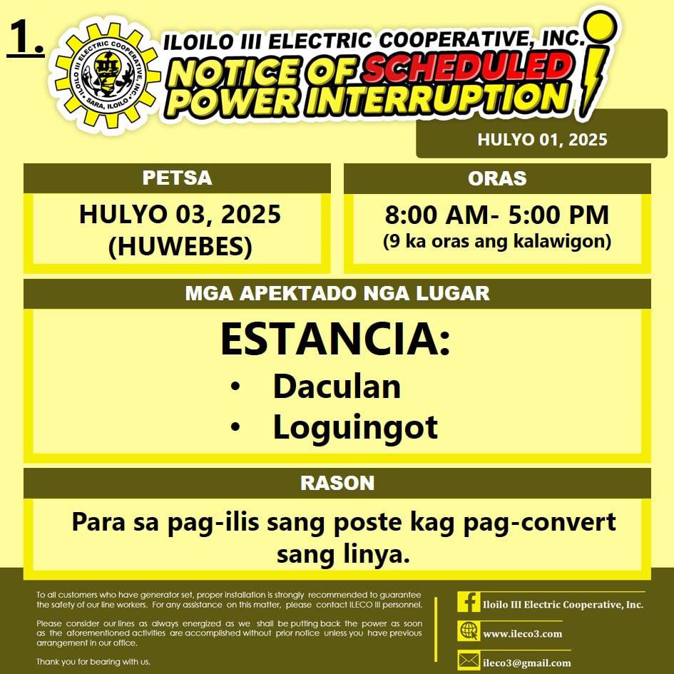 Notice to fellow-consumers that ILECO III will have SCHEDULE POWER INTERRUPTION on JULY 03, 2025 (THURSDAY), 8:00 AM- 5:00 PM (9 hours extended) for replacement of pole and conversion of line.
