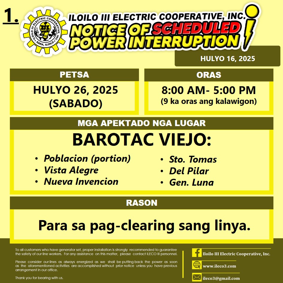 Pahibalo sa mga katapo-konsumidores nga may SCHEDULE POWER INTERRUPTION ang ILECO III sa HULYO 26, 2025 (SABADO), 8:00 AM- 5:00 PM (9 ka oras ang kalawigon) para sa pag-clearing sang linya.
