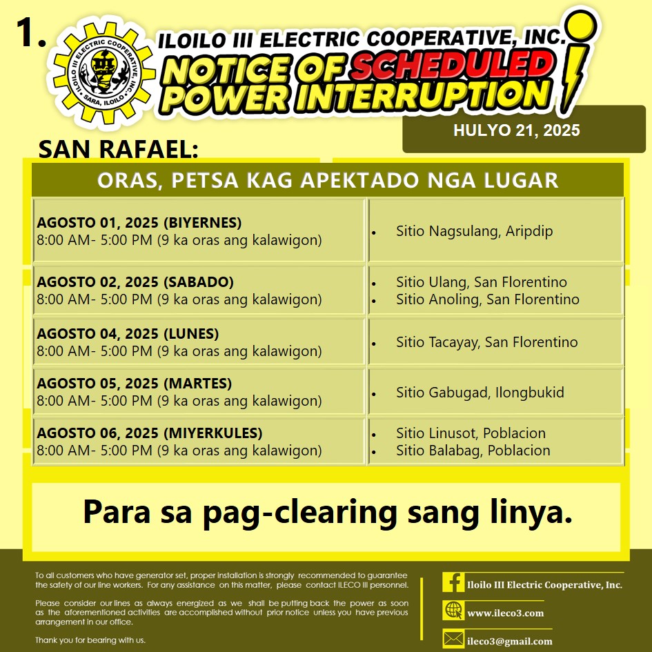 Pahibalo sa mga katapo-konsumidores nga may SCHEDULED POWER INTERRUPTION ang ILECO III para sa patigayunon nga clearing activities.