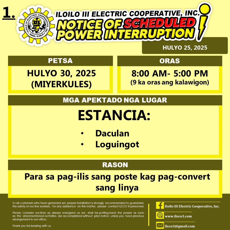 Pahibalo sa mga katapo-konsumidores nga may SCHEDULED POWER INTERRUPTION ang ILECO III sa HULYO 30, 2025 (MIYERKULES), 8:00 AM- 5:00 PM (9 ka oras ang kalawigon) para sa pag-ilis sang poste kag pag-convert sang linya.
