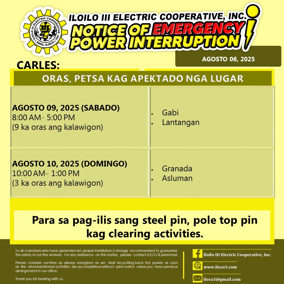 Pahibalo sa mga katapo-konsumidores nga may EMERGENCY POWER INTERRUPTION ang ILECO III para sa patigayunon nga pag-ilis sang steel pin, pole top pin kag clearing activities.