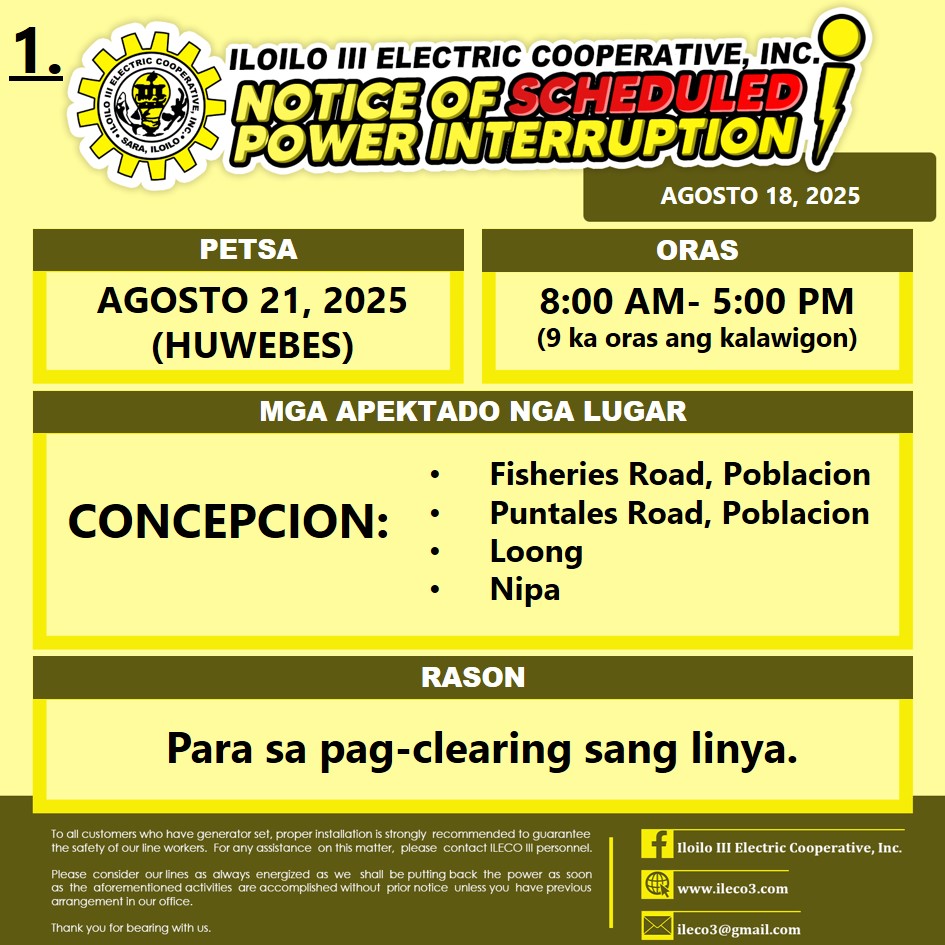 Pahibalo sa mga katapo-konsumidores nga may SCHEDULED POWER INTERRUPTION ang ILECO III sa AGOSTO 21, 2025 (HUWEBES), 8:00 AM- 5:00 PM (9 ka oras ang kalawigon) para sa pag-clearing sang linya.