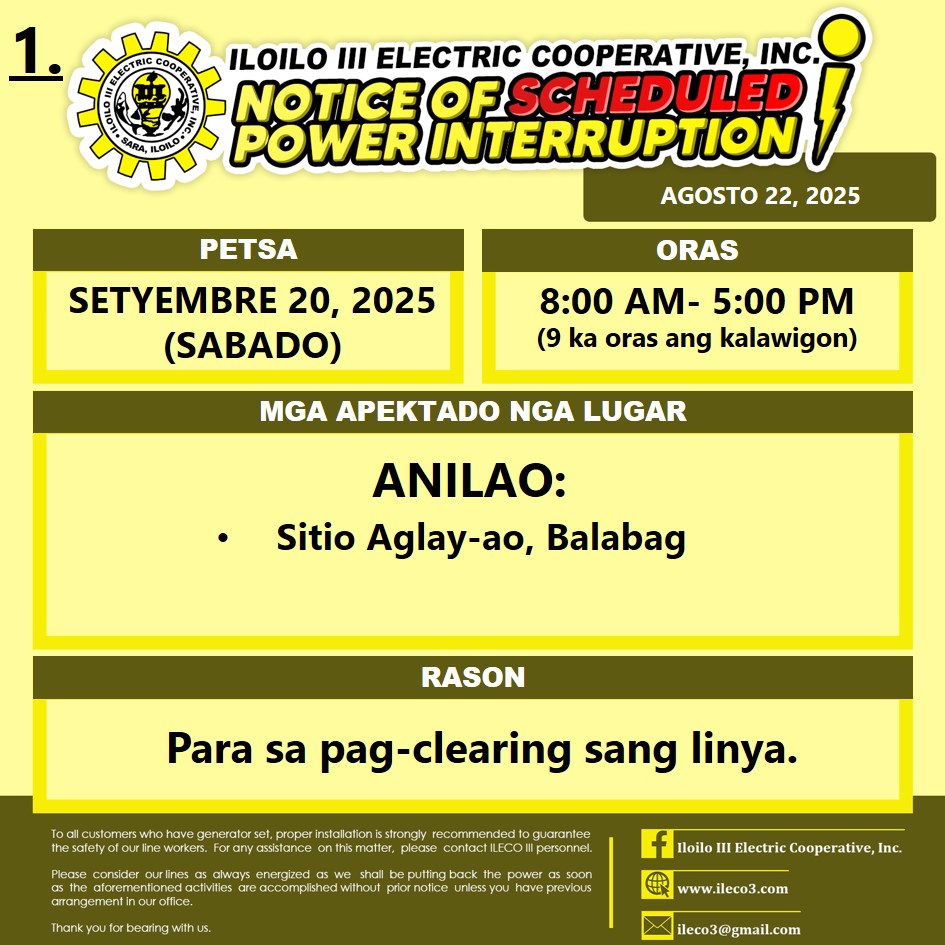 Pahibalo sa mga katapo-konsumidores nga may SCHEDULE POWER INTERRUPTION ang ILECO III sa SETYEMBRE 20, 2025 (SABADO), 8:00 AM- 5:00 PM (9 ka oras ang kalawigon) para sa pag-clearing sang linya.
