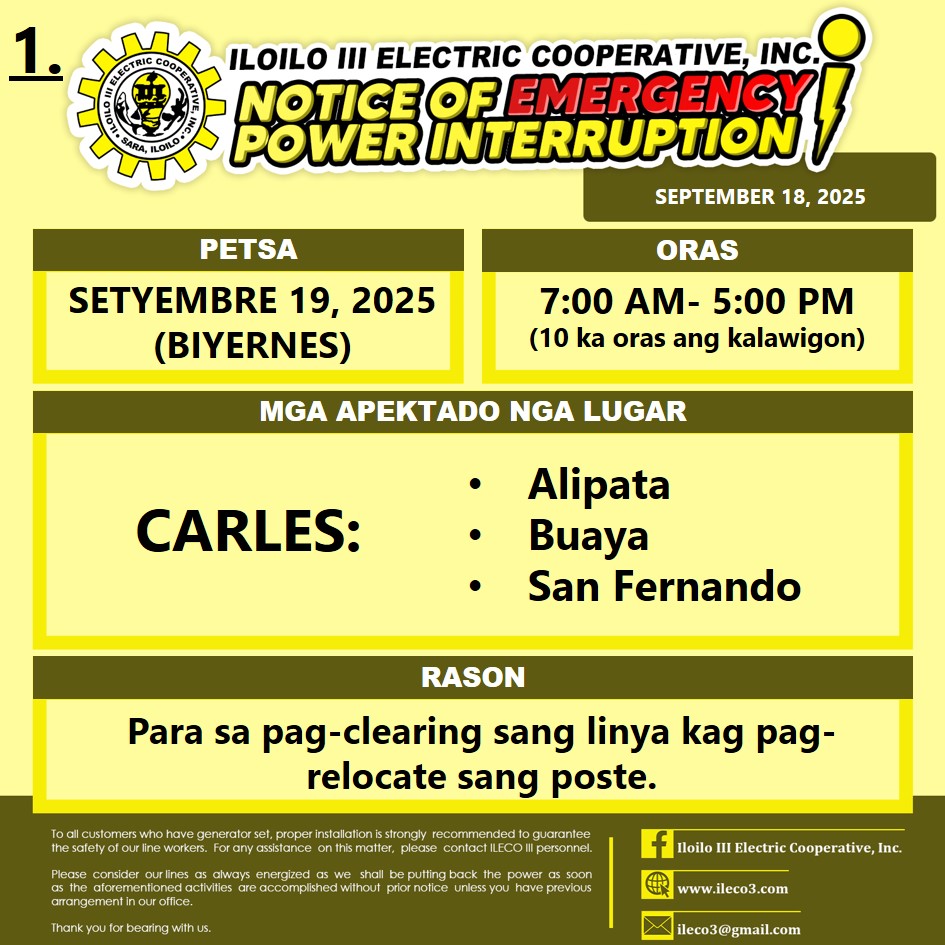 Pahibalo sa mga katapo-konsumidores nga may EMERGENCY POWER INTERRUPTION ang ILECO III sa SETYEMBRE 19, 2025 (BIYERNES), 7:00 AM- 5:00 PM (10 ka oras ang kalawigon) para sa pag-clearing sang linya kag pag-relocate sang poste.