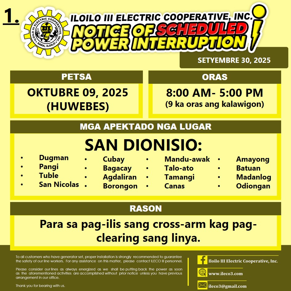 Pahibalo sa mga katapo-konsumidores nga may SCHEDULED POWER INTERRUPTION ang ILECO III sa OKTUBRE 09, 2025 (HUWEBES), 8:00 AM- 5:00 PM (9 ka oras ang kalawigon) para sa pag-ilis sang cross-arm kag pag-clearing sang linya.