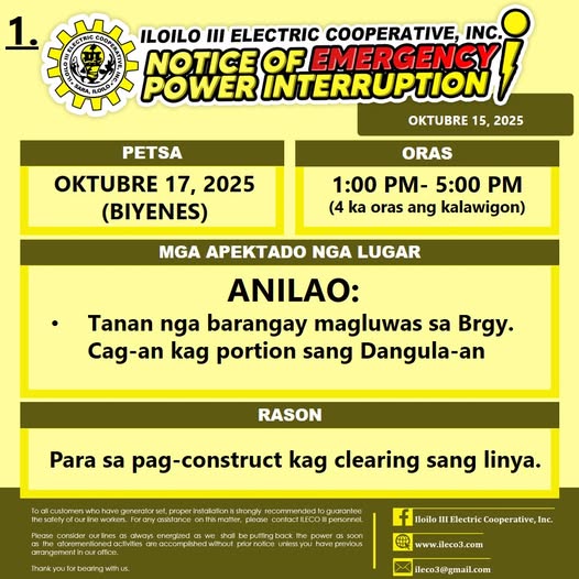 Pahibalo sa mga katapo-konsumidores nga may EMERGENCY POWER INTERRUPTION ang ILECO III sa OKTUBRE 17, 2025 (BIYERNES), 1:00 PM- 5:00 PM (4 ka oras ang kalawigon) para sa pag-construct kag clearing sang linya.
