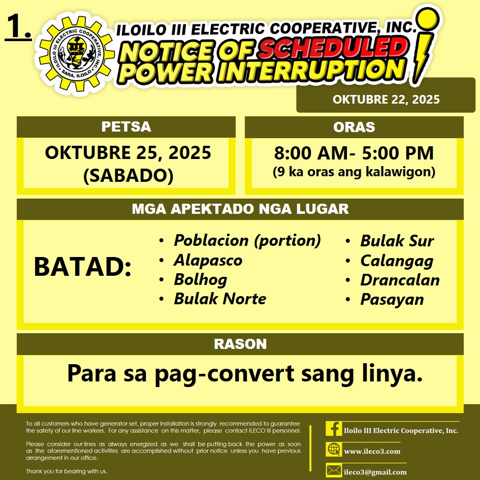 Pahibalo sa mga katapo-konsumidores nga may SCHEDULED POWER INTERRUPTION ang ILECO III sa OKTUBRE 25, 2025 (SABADO), 8:00 AM- 5:00 PM (9 ka oras ang kalawigon) para sa pag-convert sang linya.
