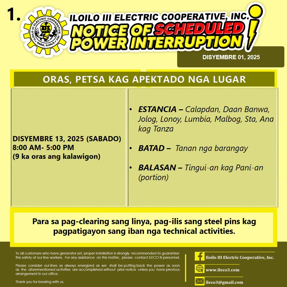 Pahibalo sa mga katapo-konsumidores nga may SCHEDULED POWER INTERRUPTION ang ILECO III sa DISYEMBRE 13, 2025 (SABADO), 8:00 AM- 5:00 PM (9 ka oras ang kalawigon) para sa pag-clearing sang linya, pag-ilis sang steel pins kag pagpatigayon sang iban nga technical activities.