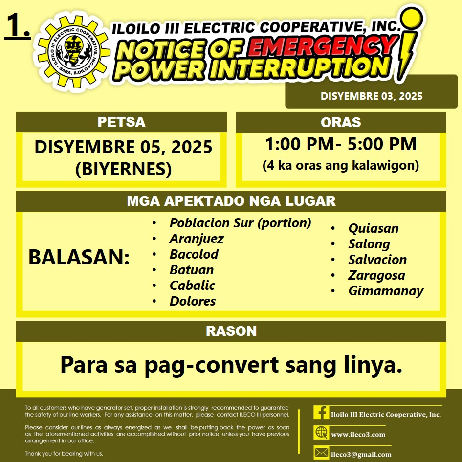 Pahibalo sa mga katapo-konsumidores nga may EMERGENCY POWER INTERRUPTION ang ILECO III sa DISYEMBRE 05, 2025 (BIYERNES), 1:00 PM- 5:00 PM (4 ka oras ang kalawigon) para sa pag-convert sang linya.
