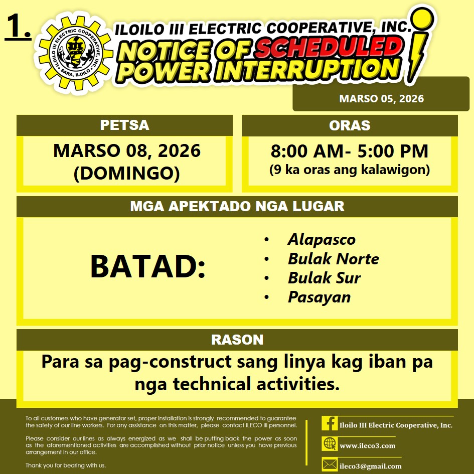 Pahibalo sa mga katapo-konsumidores nga may SCHEDULED POWER INTERRUPTION ang ILECO III sa MARSO 08, 2026 (DOMINGO), 8:00 AM- 5:00 PM (9 ka oras ang kalawigon) para sa pag-construct sang linya kag iban pa nga technical activities.